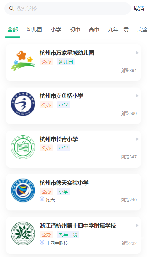 除了通过小区查学校,也可以通过学校查学区。只要在菜单栏里选择学校,拱墅区每所学校最新的学区范围都有公示。