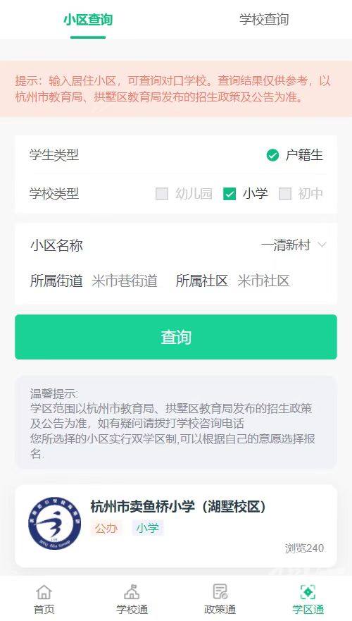 家长只要在菜单栏里找到户籍所在校区,点击查询,页面就跳出了小区所对应的小学。学校介绍里不仅有历史简介、所获荣誉、班级规模等信息,以及近三年的生源情况,如果偏多或报满,还会发出红黄色预警。