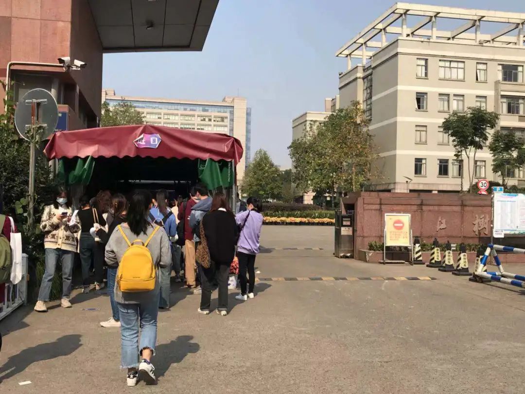 12:10,距离下午考试进场还有20分钟。树人大学门口的树人街上,已有不少考生陆续往校门口走。其中,大部分是穿着卫衣和运动鞋的身影,虽说戴着口罩,但大致还能看出都很年轻。