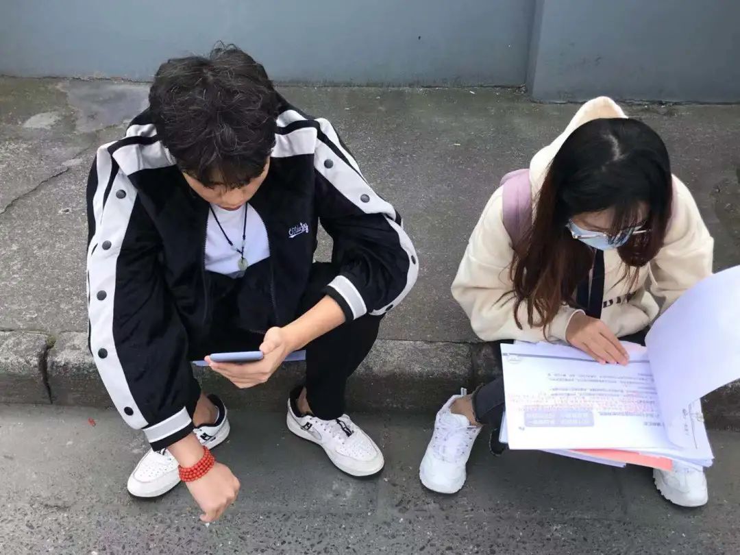 路边,一对小情侣坐在马路牙子上。女生拿着厚厚一沓笔记,上面有红色、蓝色、黄色等不同标记,埋头看着。男生拿着手机,陪坐在旁边,看看时间,轻声提醒女友:“时间快到了,进去吧,你复习这么努力,一定没问题!”