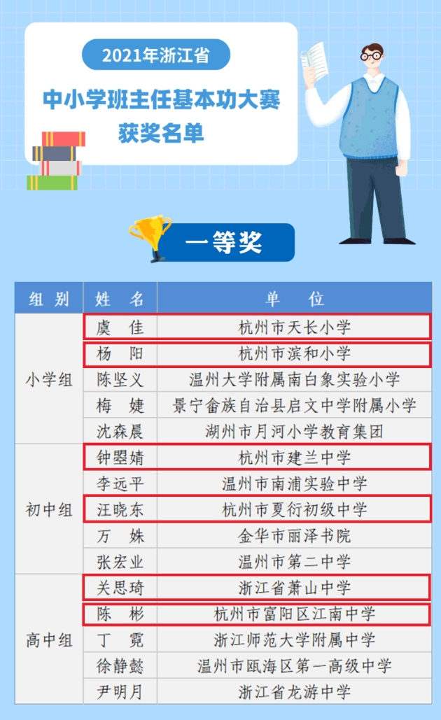 在这场象征浙江省班主任最高技能水平的比武中,杭州六位参赛老师均斩获一等奖,包揽小学、高中组的前两名以及初中的第一、第三名!这已经是杭州连续第四年一等奖选手数量位居全省第一。