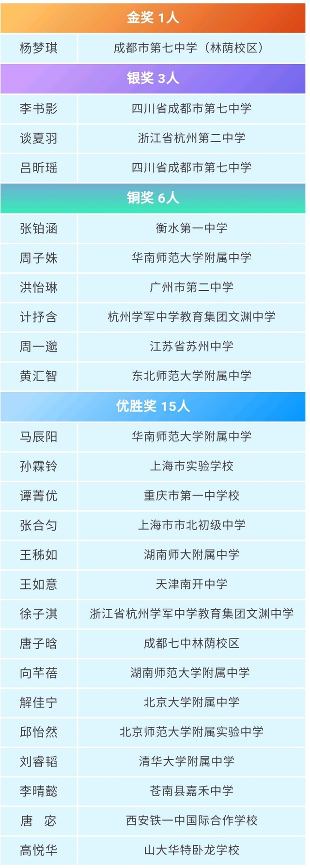 她们分别是:杭州第二中学谈夏羽,获得银奖;杭州学军中学教育集团文渊中学计抒含,获得铜奖;杭州学军中学教育集团文渊中学徐子淇,获得优胜奖;苍南县嘉禾中学李晴懿,获得优胜奖。