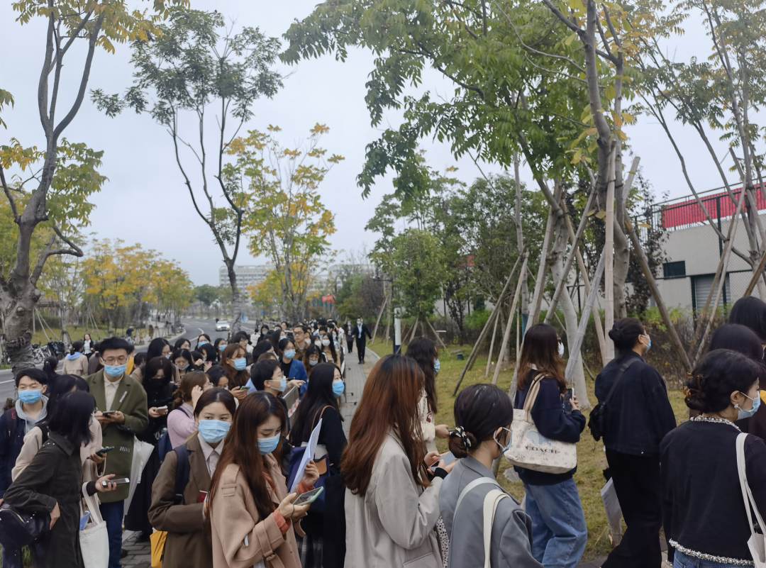 早上八点半左右,学生排起长长的队伍,凭行程码,健康码,核酸报告,戴着口罩,依次进场。他们都是第一次参加招聘会,即将完成大学生到社会人的身份转变。应聘学生中,很多女同学穿着职业装。每个同学都准备了精美的简历,证件照都是现在流行的“海马体”。