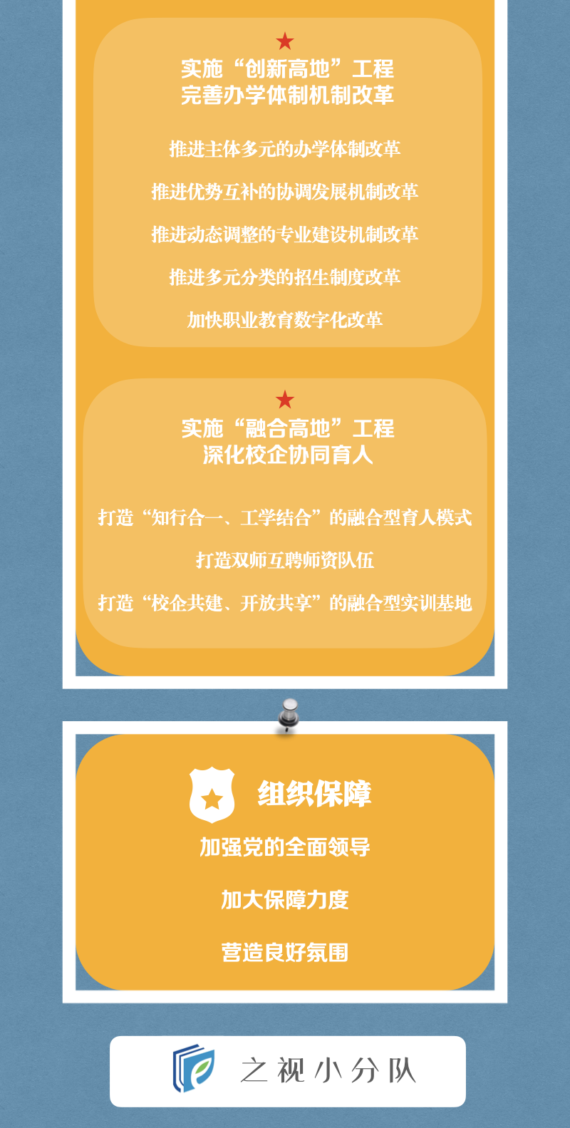 到2023年,建设好50所高水平中职学校和150个高水平专业,6所一流技师院校和30个高水平专业群。深化并扩大本科层次职业教育试点,支持符合条件的高职院校试办职业教育本科专业或升格为本科层次职业学校。