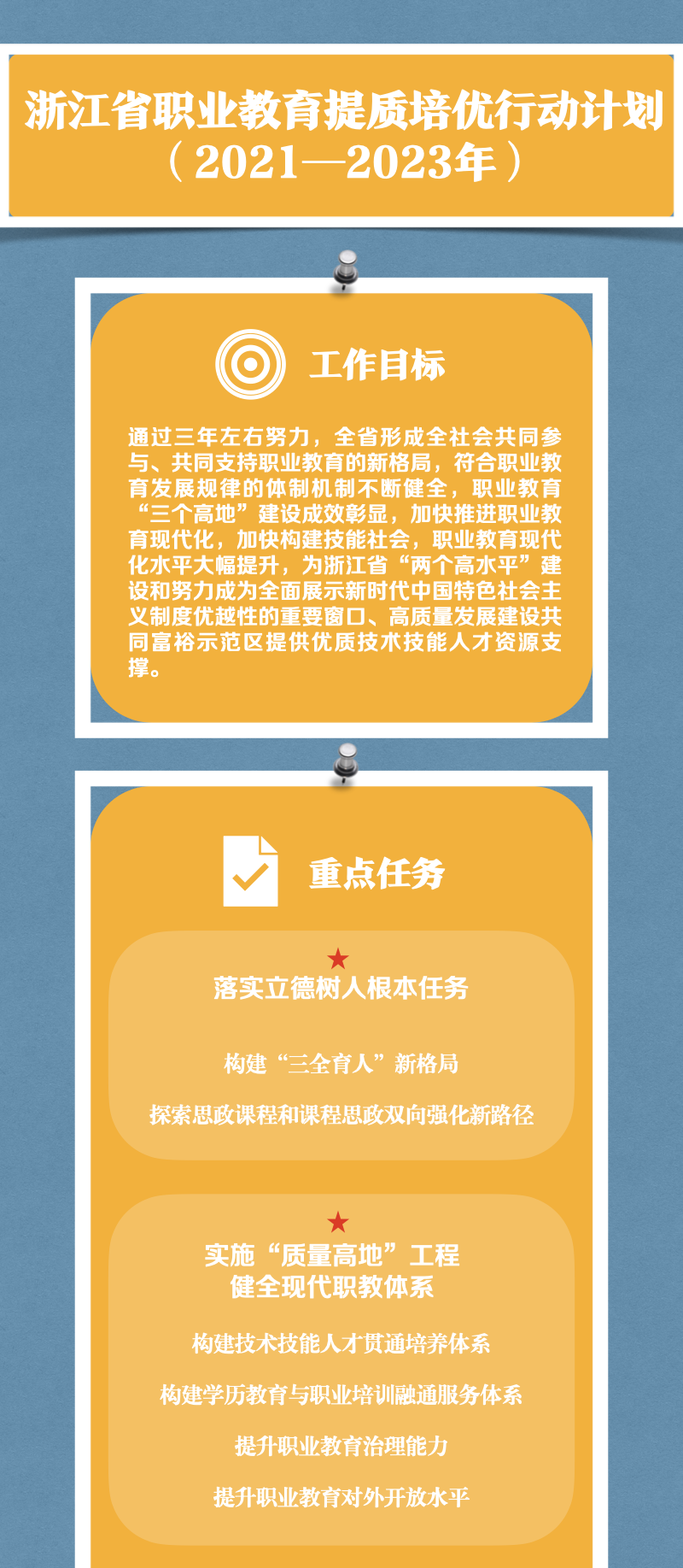 浙江发布消息:日前,省教育厅等八部门联合印发《浙江省职业教育提质培优行动计划(2021—2023年)》,促进职业教育提质增优、增值赋能、以质图强。