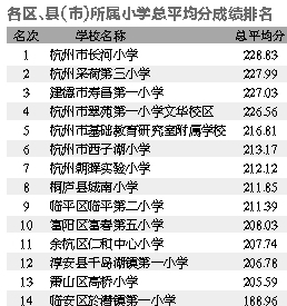 在各区、县(市)义务教育阶段总平均分成绩排名中,西湖区排第一,滨江区和建德市紧随其后。在抽测的小学中,杭州市长河小学排名第一,杭州采荷第三小学、建德市寿昌第一小学位列第二、第三名。
