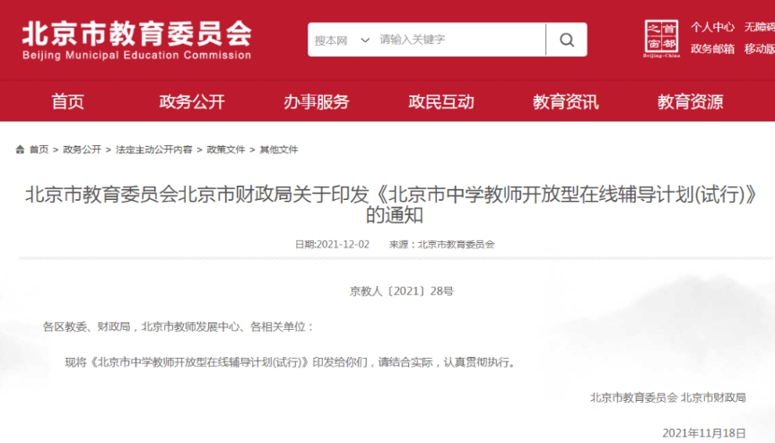 12月2日,北京市教委官网公布了北京市教育委员会、北京市财政局关于印发《北京市中学教师开放型在线辅导计划(试行)》的通知。
