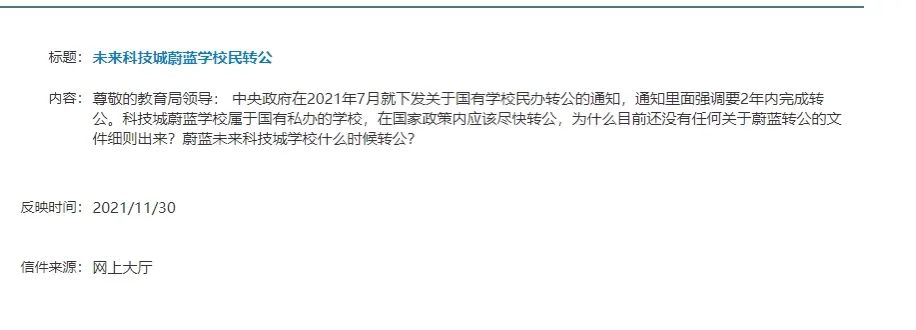 内容:尊敬的教育局领导:中央政府在2021年7月就下发关于国有学校民办转公的通知,通知里面强调要2年内完成转公。科技城蔚蓝学校属于国有私办的学校,在国家政策内应该尽快转公,为什么目前还没有任何关于蔚蓝转公的文件细则出来?蔚蓝未来科技城学校什么时候转公?