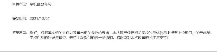 答复意见:您好,根据国家相关文件以及省市相关会议的要求,余杭区已经把相关学校的具体信息上报至上级部门,关于此类学校后期的处理与转型,等待上级部门的进一步通知。