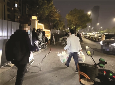 龙湖春江天玺一期北门,一排货架在1个小时内就搭建完成了。外卖小哥一拨接一拨,戴着口罩,联系着收货人。“你好,你的外卖到了,我给你放货架第二层,左侧。”一位叮咚买菜的外卖小哥,麻利地卸下12单菜品,一一对接。小哥说,蔬菜、肉类、鸡蛋、牛奶等,加起来有30多斤。