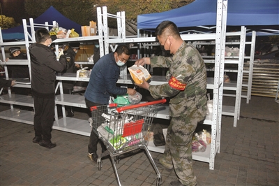 小区门口,一位小伙子拎着满满的4袋子食品、生活必需品,隔着两重口罩,他告诉来取东西的女友说:“按照你的清单买的,不够再给我打电话。就不抱了啊,你照顾好自己。”