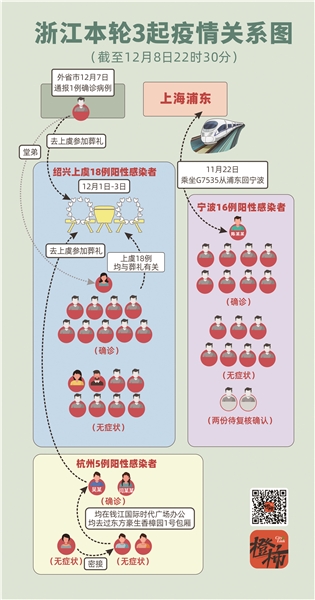 杭州首例病例吴某,12月1日、2日往返上虞,参加孙某奶奶的葬礼,12月3日返杭后,感染了其女友、同事等,截至12月7日15时,杭州累计报告确诊病例2例,无症状感染者3例。