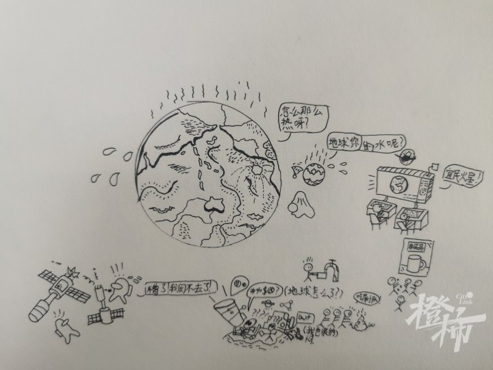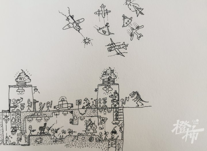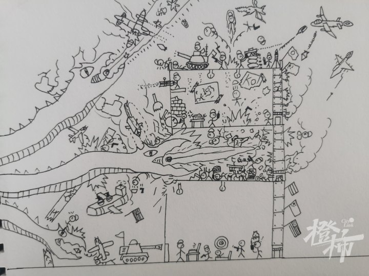“他画的属于线描画,不像水彩画之类注重技巧和画法,而是需要发挥丰富的想象力,进行自由的创作。”王景星经常想到什么就画下来,积攒了很多火柴人的故事,他的作业本、课本上,也常常会出现火柴人的形象。