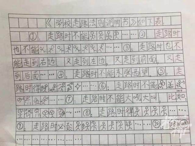 火柴人的形象,最早是出现在一份《学校走路法则说明书》里。那时,王景星因走路姿势过于花俏,去老师办公室交作业的路上不小心“啪唧”一声滑倒在地,班主任余冠瑾看到了,又心疼又好笑,便给他布置任务:“你去写一下该如何好好走路吧。”于是便有了这份传神的说明书——