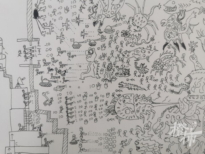 这个男生名叫王景星,是钱塘实验小学一名四年级的小学生。在他的画里,没有五颜六色的涂鸦,只有简单的线性表达,但画里包含的细节十分丰富,仔细看下来,虽然都是造型简单的火柴人,但每个小人的造型都不一样,仿佛每个人都拥有自己的情绪和故事,简直是一个火柴人的世界!