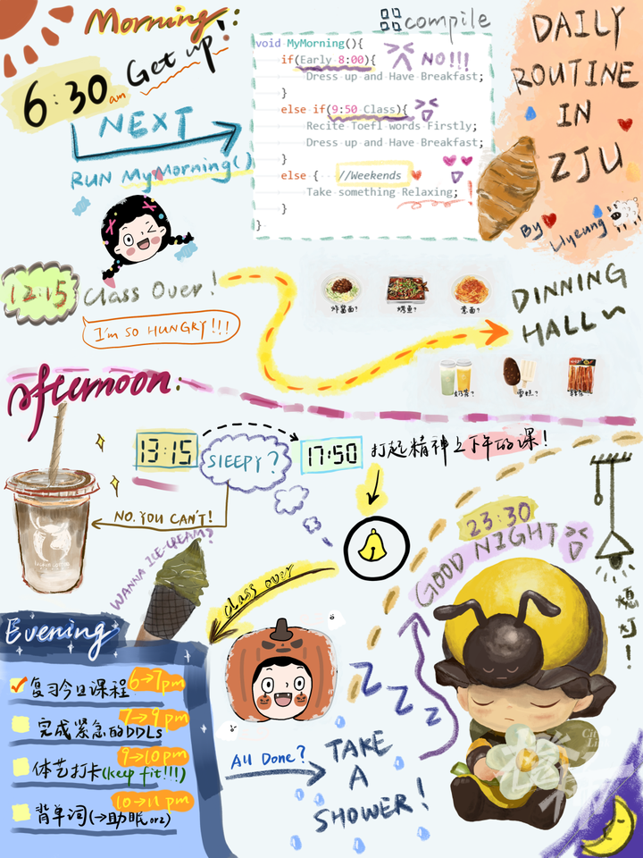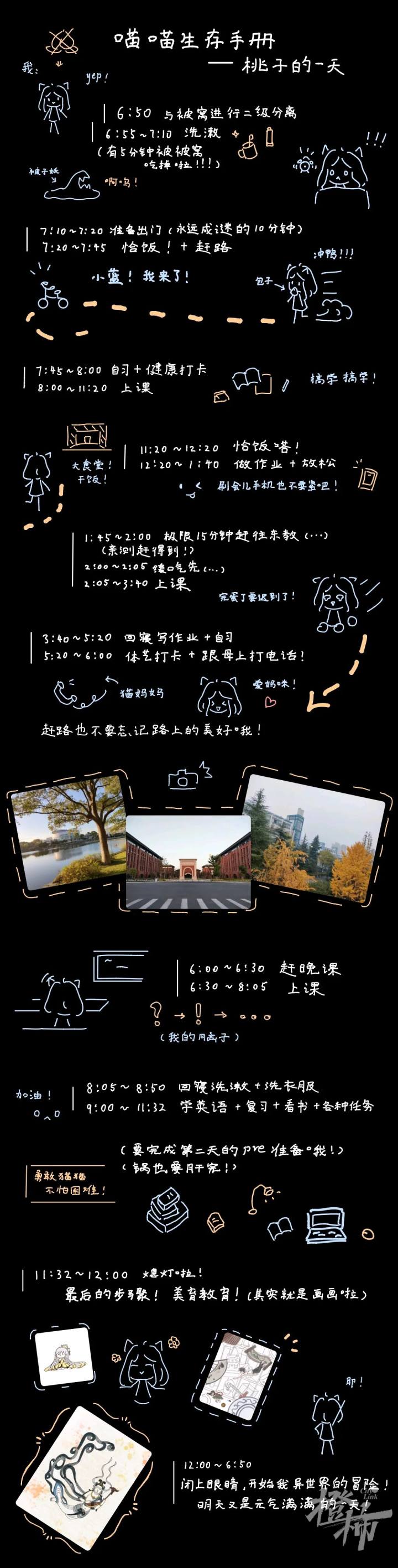 陶心滢是浙大一名大一的学生,平时很喜欢猫,这次她绘制的作息表,就叫做《喵喵生存手册》,即她自己的生活作息表。简笔画的画风可爱,作息表的语言风格轻松幽默,比如,早上起床叫“与被窝进行二级分离”。