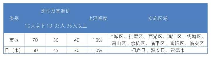 其中市区10人以下基准价为70元,10-35人基准价55元,35人以上基准价40元,上浮幅度为10%;县(市)10人以下基准价为60元,10-35人基准价45元,35人以上基准价30元,上浮幅度为10%。