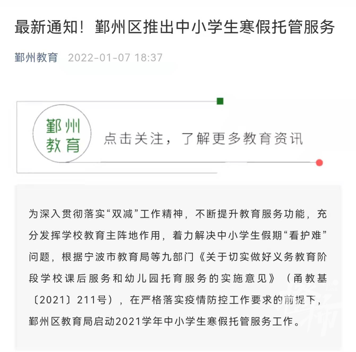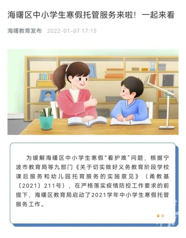 都市快报报道 宁波海曙区和鄞州区教育局,1月7日发布开展“中小学寒假托管班服务”的通知。寒假临近,这一通知引起了很多家长的关注。