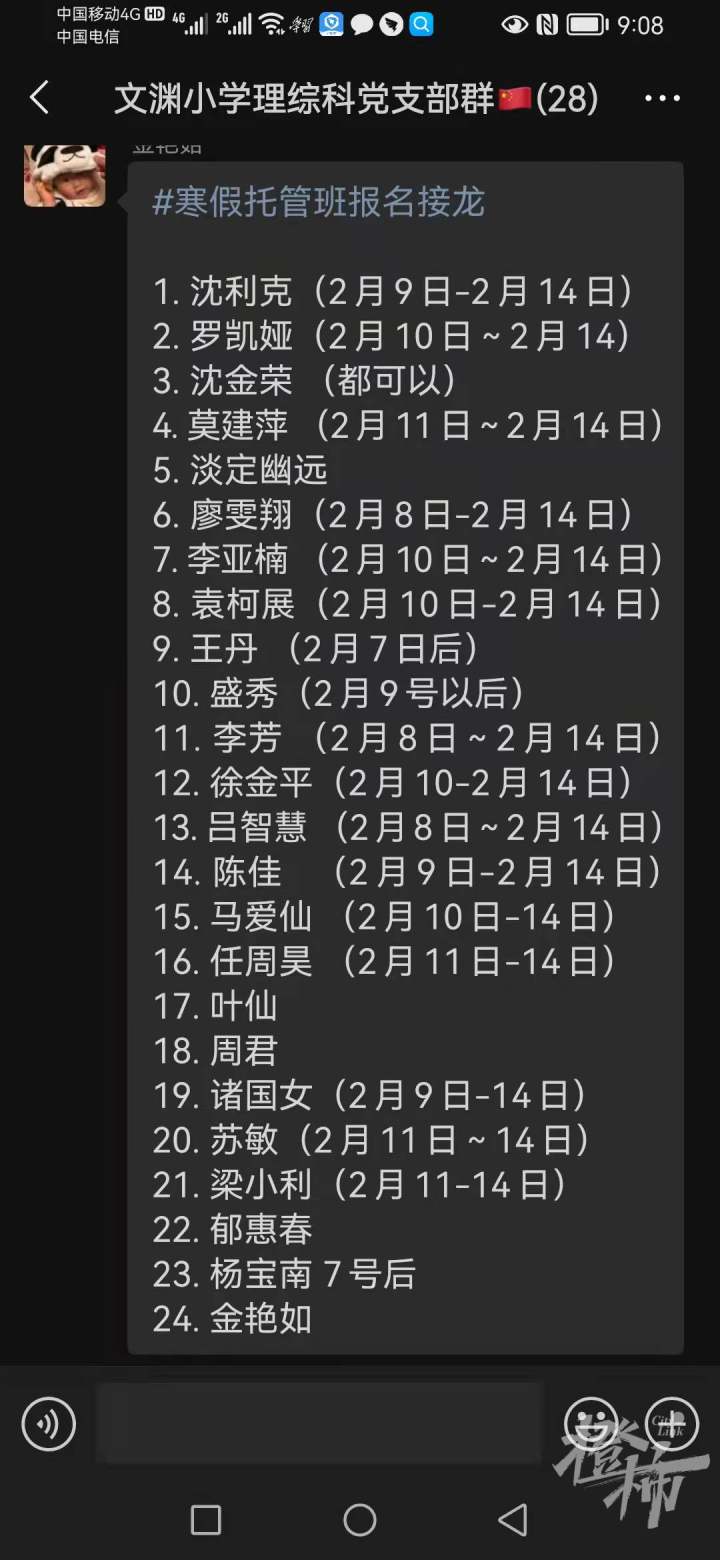 学校教师的党支部微信群里,党员年青教师沈利克第一个报名,很快,就有20多位老师陆续报名参加,还标注了自己可以值班的时段。