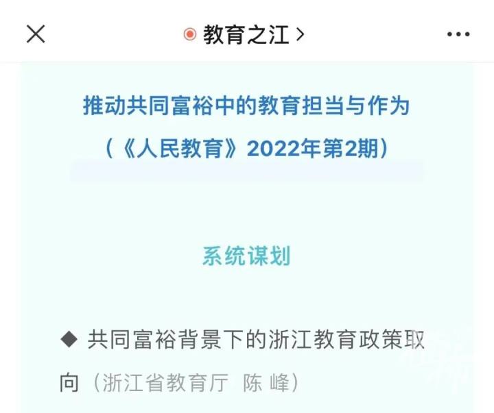 前两天,浙江省教育厅官方微信公众号“教育之江”刊发了一篇文章,题为《共同富裕背景下的浙江教育政策取向》,作者是浙江省教育厅副厅长陈峰。