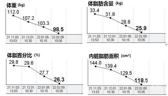 从2021年11月初起,小冯就在临床营养科冯钰婷医生的指导下开始科学减重。冯钰婷医生给他做了体成分测定和膳食调查后,为他量身定制了限能量平衡膳食+合理运动的减重方案。饮食方面,每日摄入总能量减少1/3。运动方面,中等强度的有氧运动每周150分钟以上。