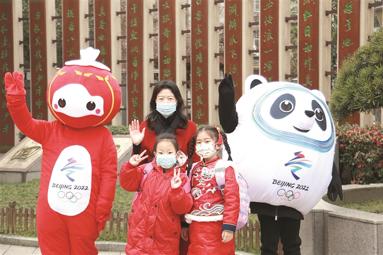 一早,回澜小学门口,迎接返校学生们的冰墩墩、雪容融吸引了学生和家长们的注意。同学们纷纷和可爱的冬奥吉祥物打招呼、合影。校园通道中还挂满了火红的灯笼和冬奥会项目的标牌。“每次开学我都很期待,校园里总是有满满的惊喜。”四年级的周同学高兴地说道。