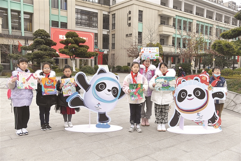 金山小学的同学带来了寒假期间绘制的庆祝北京冬奥会、喜迎杭州亚运会的小海报 记者 范方斌 摄