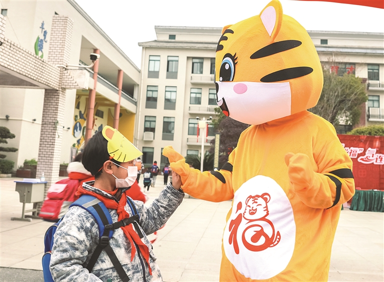 值得一提的是,在校门口送上祝福的四只“福气虎”原来是新街四小六年级的学生们。“这学期也是我们在学校的最后一学期了。我想着用这样的方式给自己留点纪念,也给学弟学妹带去点惊喜。”迎接了最后一名同学,摘下虎头帽,六年级的吴鸿霆笑着说道。