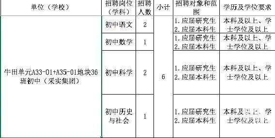 去年12月上城区公开招聘120名教师,且聘用人员列入事业编制,其中,牛田单元A33-01+A35-01地块36班初中(采实集团),按计划招聘6名新教师。