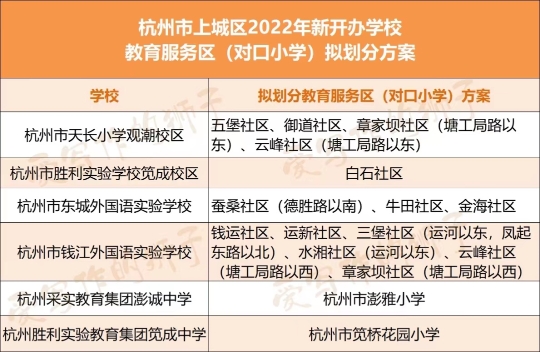 都市快报报道 昨晚,上城区教育局公布了《关于对杭州市上城区2022年新开办学校教育服务区(对口小学)拟划分方案征求意见的通告》,2022年上城区将新开办6所学校,分别是:杭州市天长小学观潮校区、杭州市胜利实验学校笕成校区、杭州市东城外国语实验学校、杭州市钱江外国语实验学校、杭州采实教育集团澎诚中学、杭州胜利实验教育集团笕成中学。