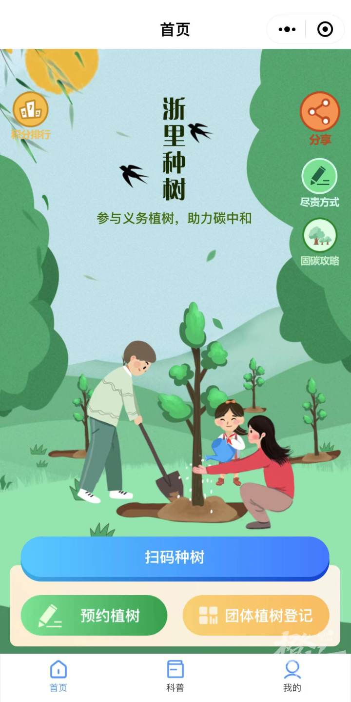 植树者可在植树现场用手机扫码完成种树记录,也可在线预约植树,或在完成植树活动后登记植树信息,多种方式履行公民义务植树责任。通过“浙里种树”小程序,植树者可查看植树形成的年固碳值、获得林业碳积分,并转化为碳普惠积分,参与全省碳普惠行动。