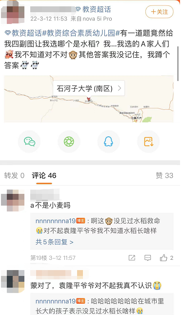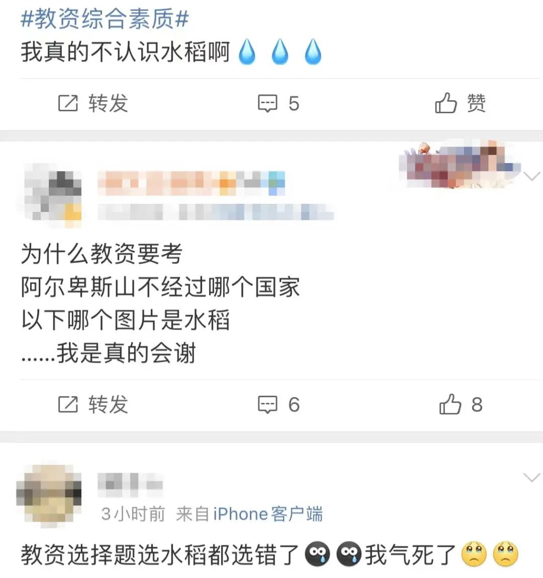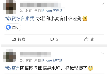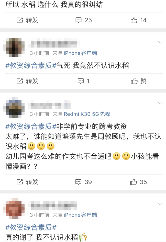 除了作文题,据参加考试的考生说,主要考的是教师专业领域内容。有位网友“哀嚎”:考了4张图,让选出哪个是水稻,我自己选了A,蹲一个正确答案。