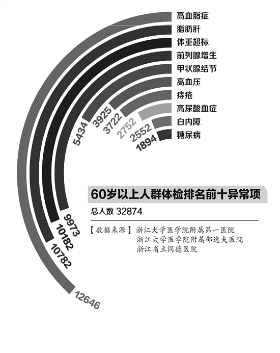 在33万人数据的基础上,记者还收集了浙大一院、邵逸夫医院、省立同德医院三家医院60岁以上人群的体检数据,体检总人数为32874人。