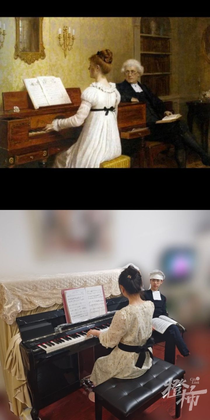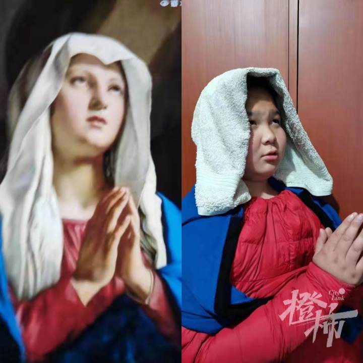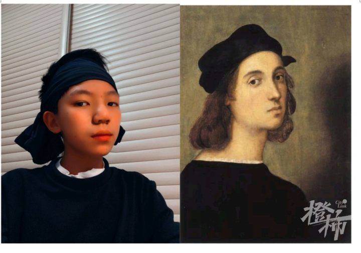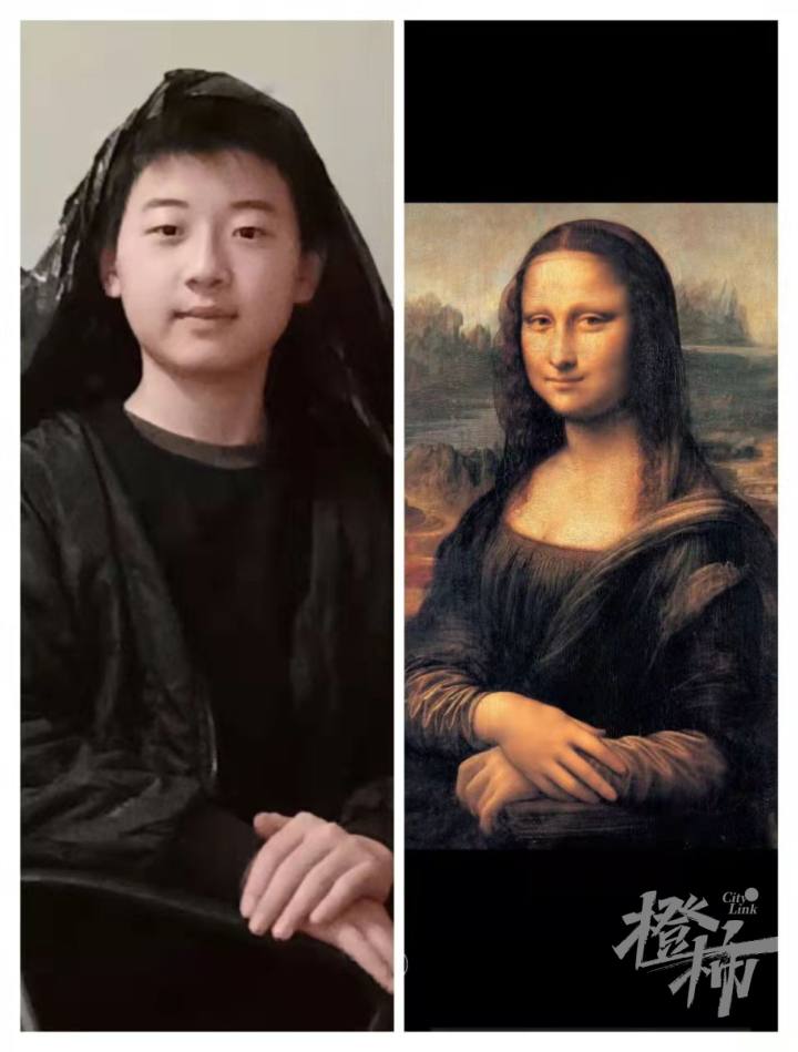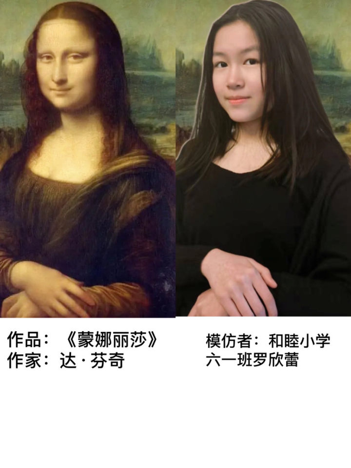 还有多位同学勇敢地模仿《蒙娜丽莎》,女生罗欣蕾的眼神、发型和手部姿势,几乎原版复刻,让人啧啧称赞。但是