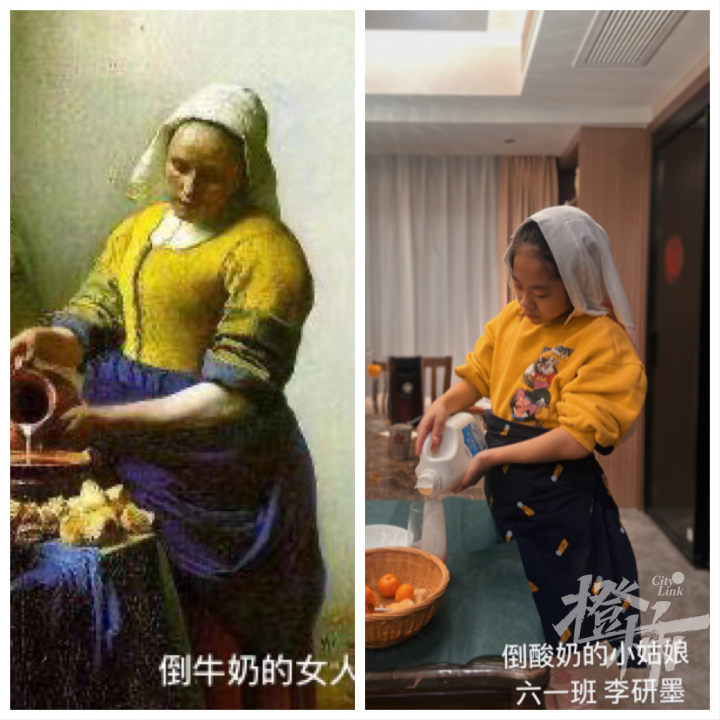 校长助理王亚芬老师说:“名画不再是博物馆里的展品,而是孩子们了解艺术,喜爱艺术的渠道。大家用毛巾、塑料袋、围巾、书本等素材,把自己装扮成蒙娜丽莎、梵高等画作之中的人物。真是创意无限。老师们看完作业,在教室和孩子们分享,又是一轮欢笑的时光。”