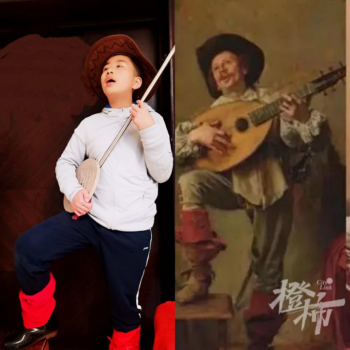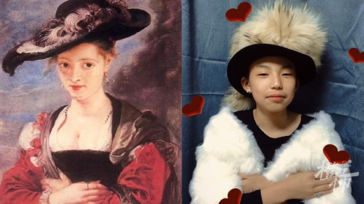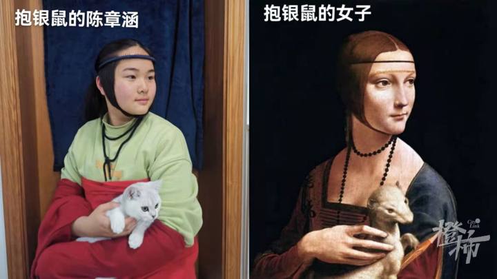 比如女生陈章涵,模仿《抱银鼠的女子》,家里的喵星人,被她抱在怀里,也神还原了那只银鼠。画面看起来和谐又逗趣。