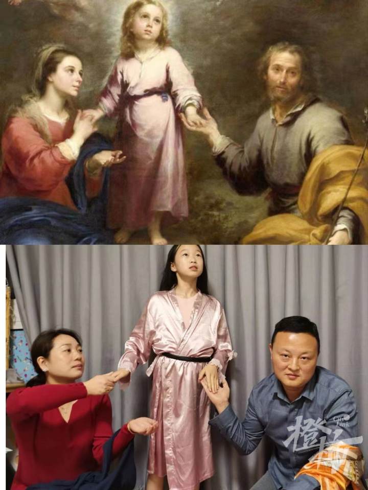 玩到后面,全家齐上场。来看这幅名画,女儿穿着粉色连衣裙,站在中间。