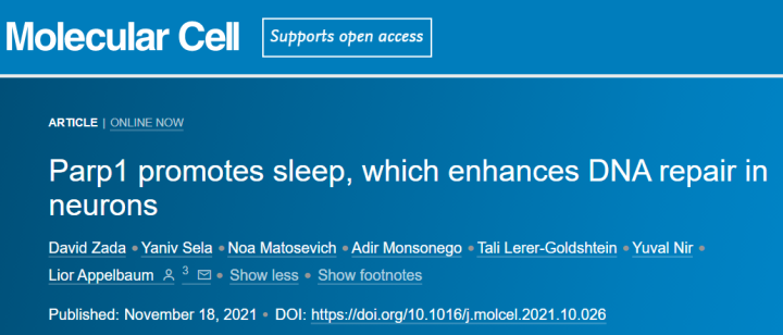 研究发现,一种叫做PARP1(多聚ADP核糖聚合酶1)的蛋白质在DNA修复过程起关键作用。这种蛋白质可以感知到清醒时不断增加的DNA损伤,如果损伤达到某个阈值,它就向大脑发出信号,促进睡眠和DNA修复,从而减少DNA断裂。相反,如果抑制了PARP1,斑马鱼就不会去睡觉,DNA修复也不会发生。