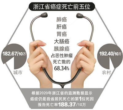 根据2020年浙江省相关监测数据显示:癌症仍是我省居民死亡的第1位死因,报告死亡率188.37/10万,其中城市182.67/10万,农村192.40/10万。位居死亡率前5位的恶性肿瘤为肺癌、肝癌、胃癌、大肠癌、胰腺癌,占恶性肿瘤死亡数的68.34%。
