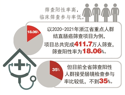 省肿瘤防治办公室杜灵彬副主任告诉记者:从我省目前正在开展的4个层级癌症筛查项目结果显示,存有“一高一低”的现象,即筛查阳性率高,临床筛查参与率低。他以2020—2021年浙江省重点人群结直肠癌筛查项目为例,项目总共完成411.7万人筛查,筛查阳性率为18.06%。筛查阳性表明该居民罹患该癌症的风险比评估中低风险的人群更高,需要参与临床筛查,明确其身体状态,很可惜目前全省筛查阳性人群接受肠镜检查参与率比较低,不到35%。“高危人群评估、评估阳性进行相应的临床筛查,早发现,早治疗,这是癌症三级预防中,不可或缺的一环。”