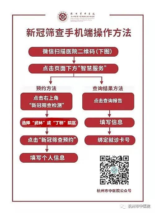 关注“杭州市中医院”微信公众号,点击主页菜单栏中“智慧服务”,进入后“新冠筛查预约”,选择武林院区或丁桥院区后进入预约流程,完成线上预约、线上支付后可到相应预约地点进行采样(请点击下方链接查看详细指导)。