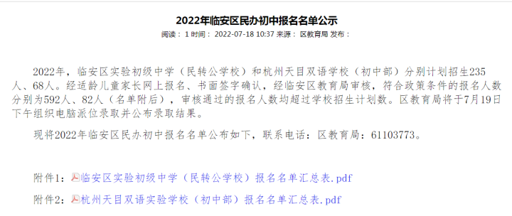 经适龄儿童家长网上报名、书面签字确认,经临安区教育局审核,临安区实验初级中学(民转公学校)和杭州天目双语学校(初中部)符合政策条件的报名人数分别为592人、82人,审核通过的报名人数均超过学校招生计划数。
