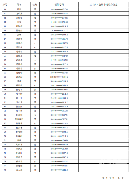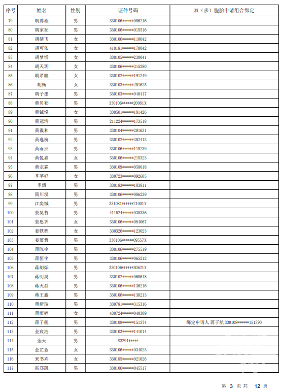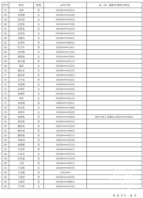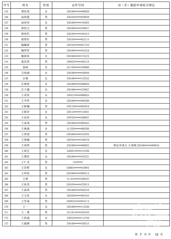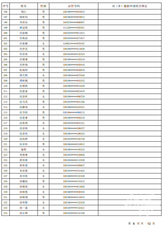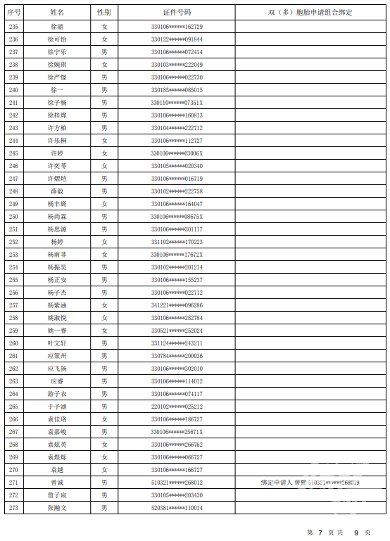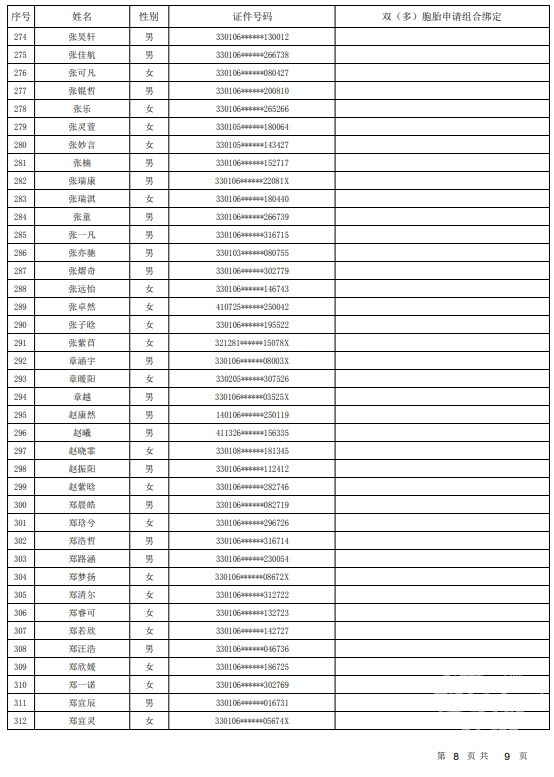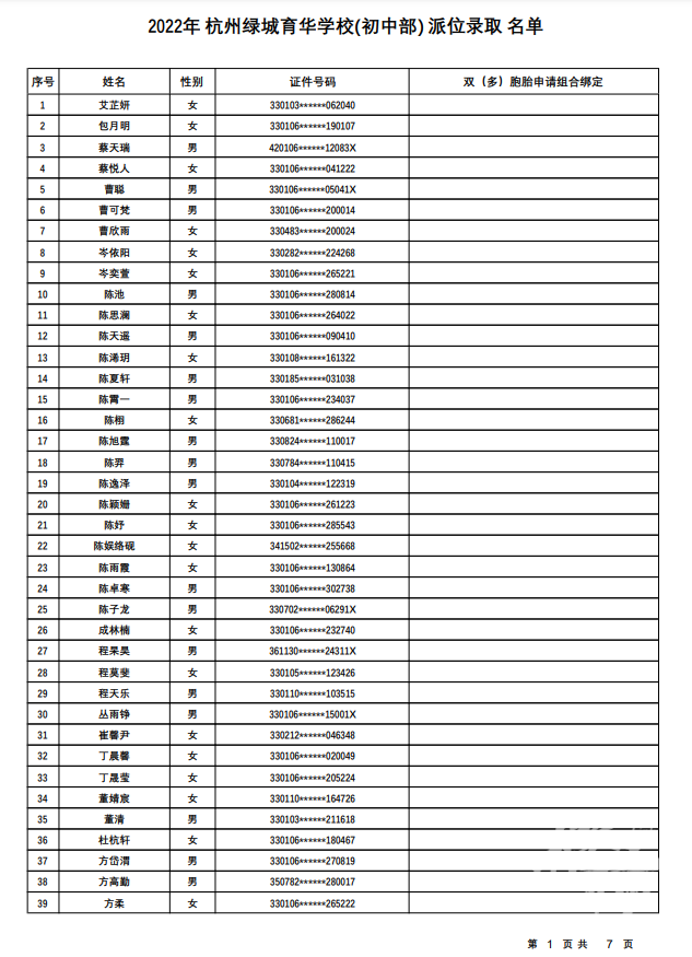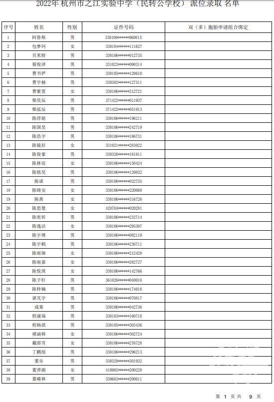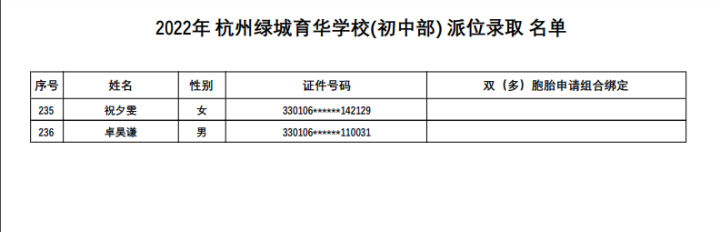 杭州市采荷实验学校初中部(民转公学校)录取名单——