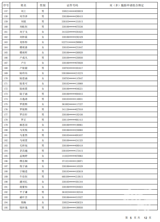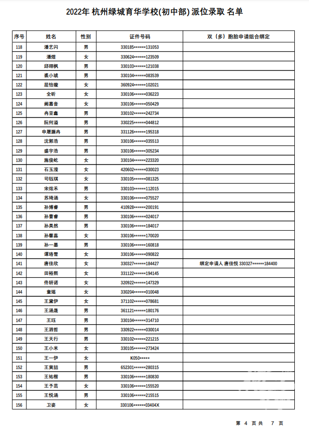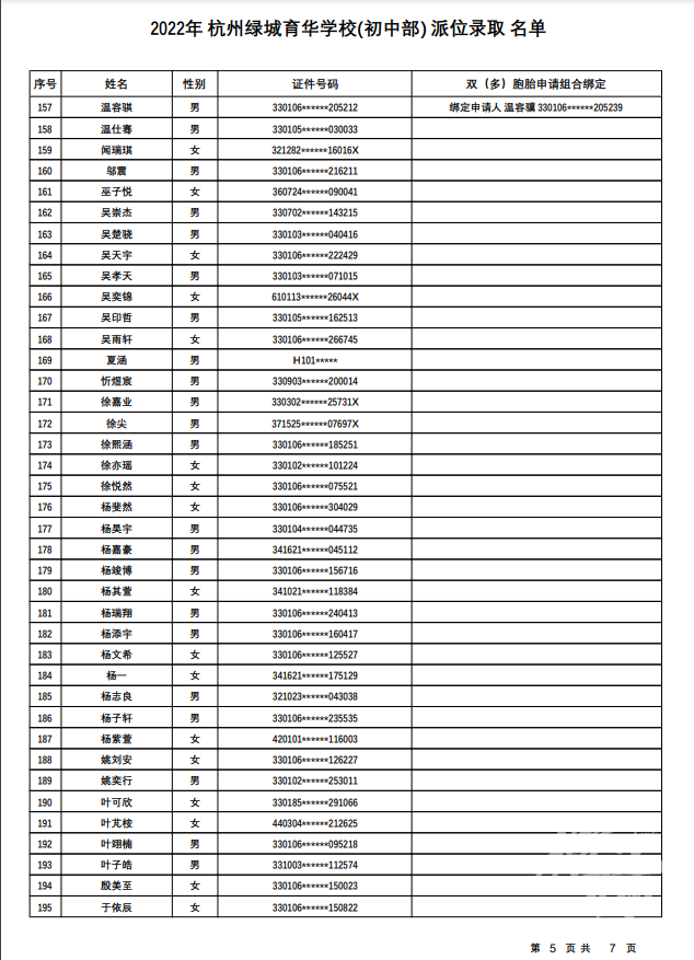 杭州观成实验学校初中部(民转公学校)录取名单——