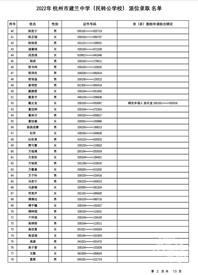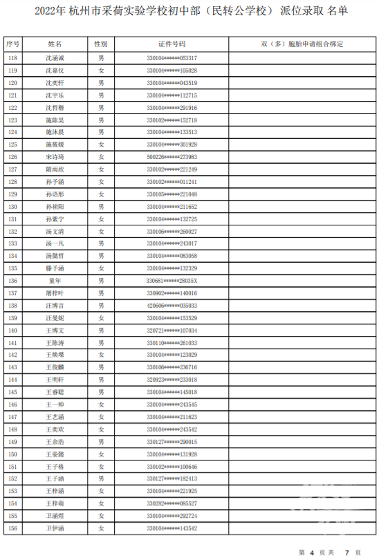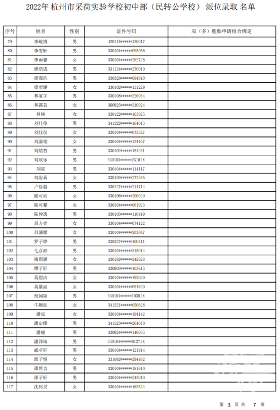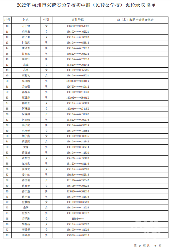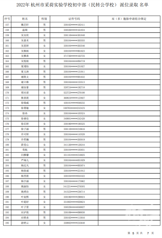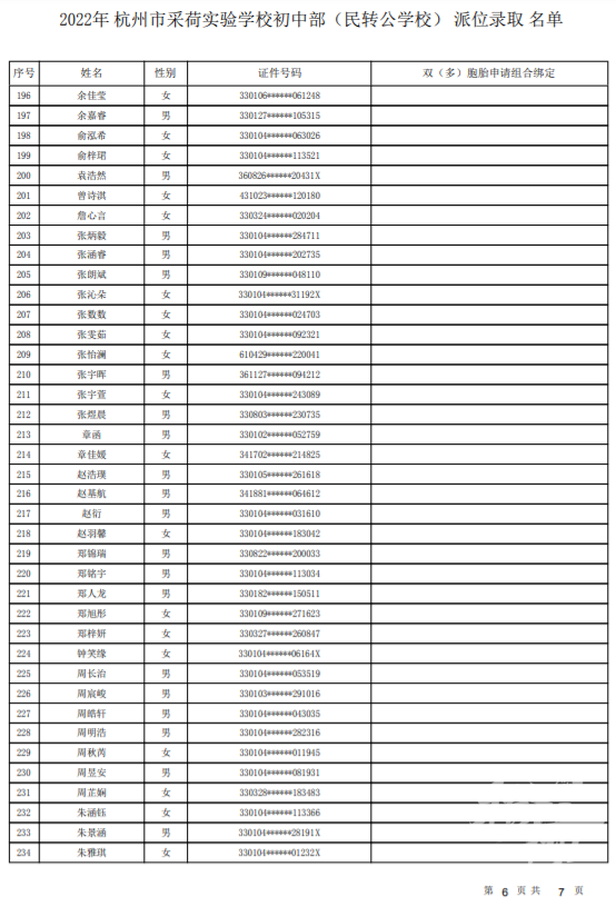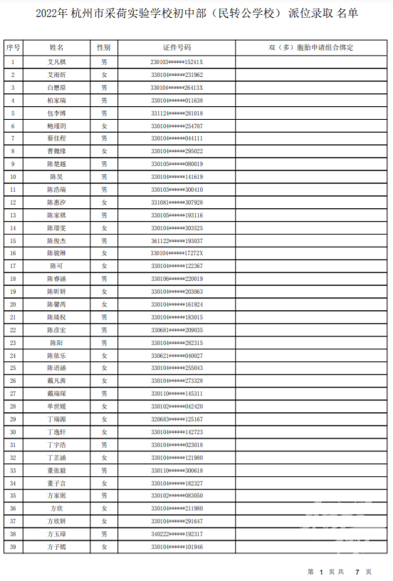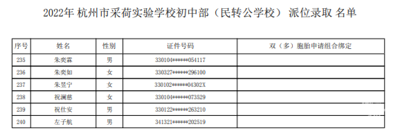 杭州市采荷实验学校初中部(民转公学校)录取名单——