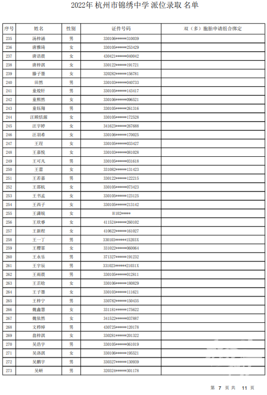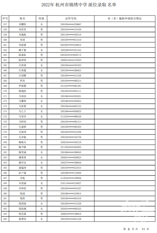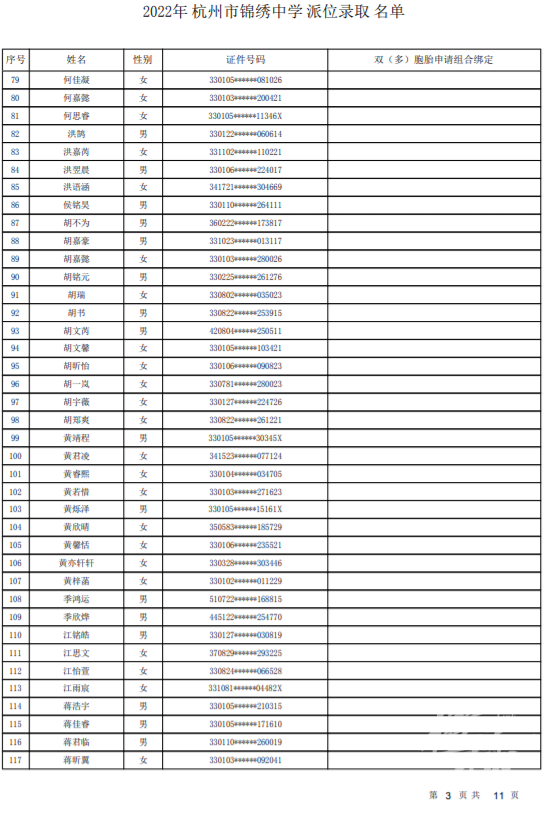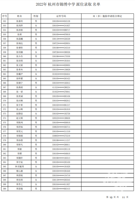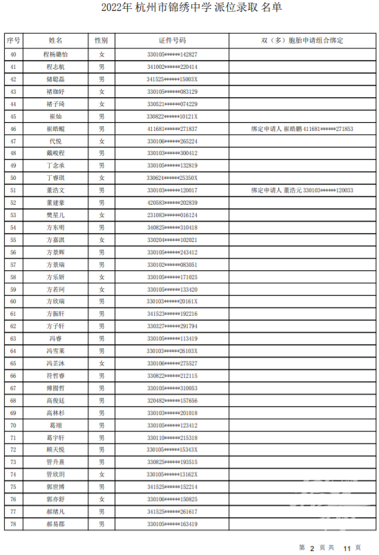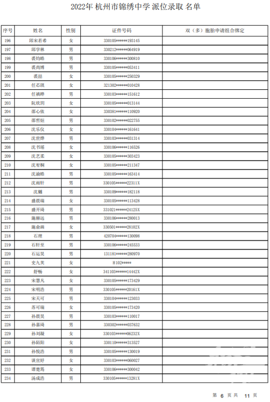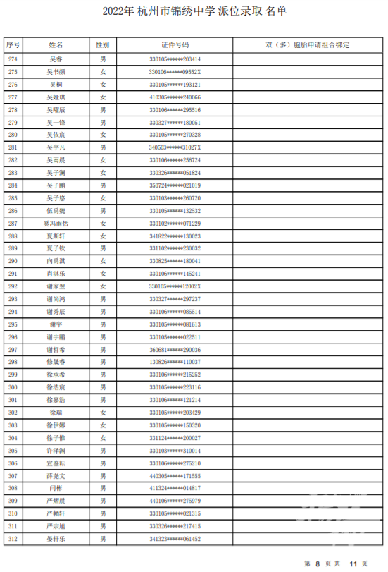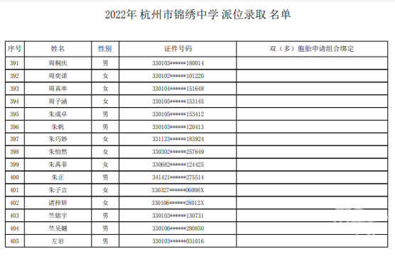 杭州市锦绣中学录取名单——