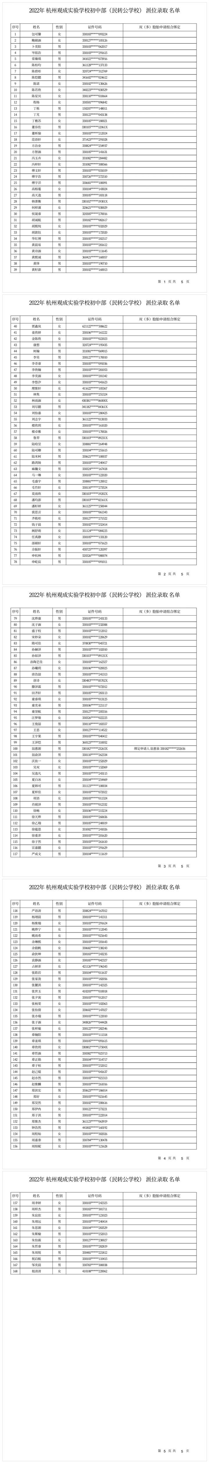 杭州观成实验学校初中部(民转公学校)录取名单——
