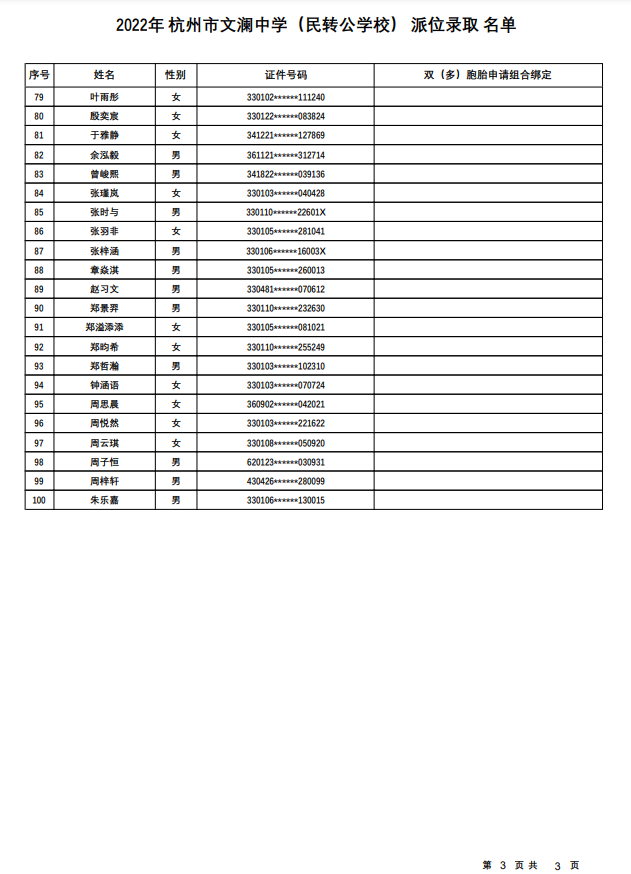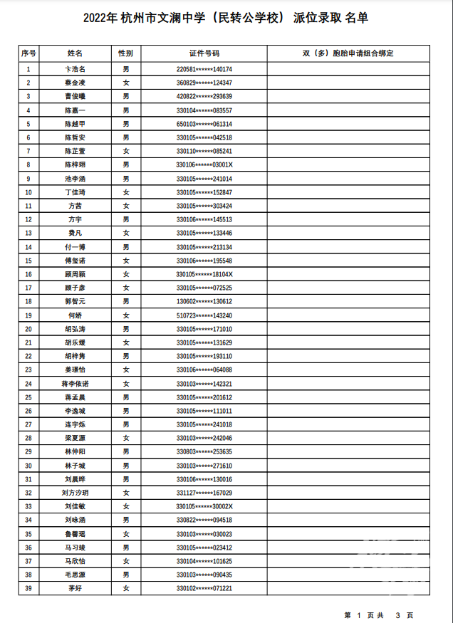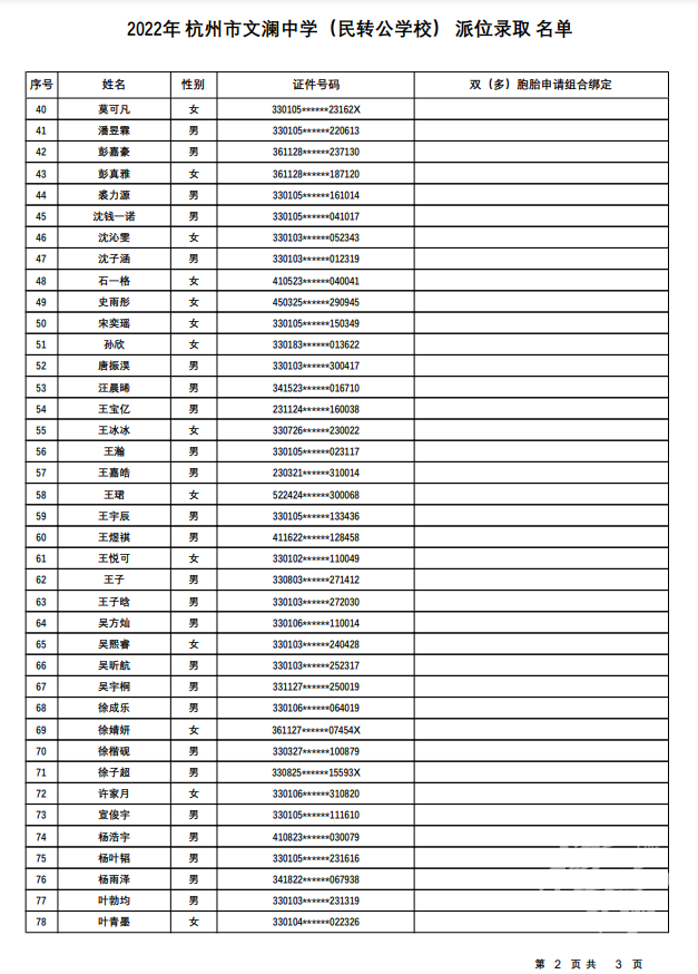 杭州市文澜中学(民转公学校)录取名单——