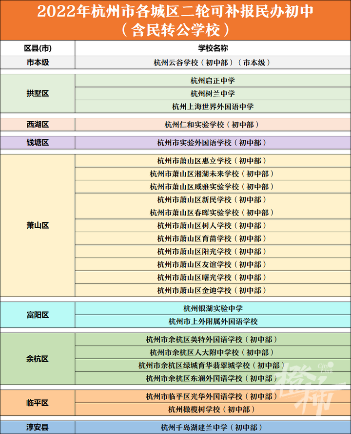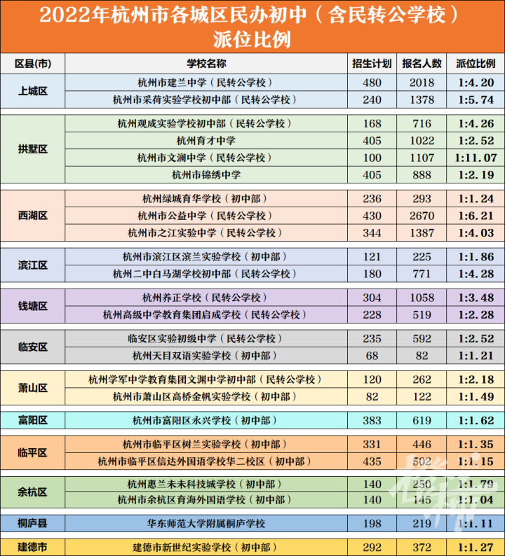 昨天,杭州各城区已经公布各校报名人数,来看看这张派位比统计表——