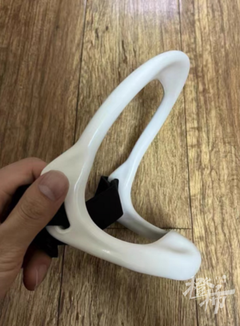 郑女士口中的“防低头神器”构造简单,其实就是一个带曲度的简易颈托,分成上下两部,佩戴时上部抵住下巴,下部抵住胸口,后方用一条魔术带扣住。